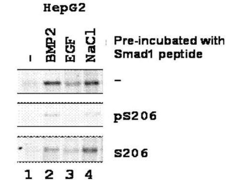 Immunogen: This affinity purified antibody was prepared from whole rabbit serum produced by repeated immunizations with a phosphorylated synthetic peptide corresponding to the region of amino acids containing serine 206 of human SMAD1 protein.