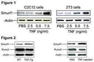 Members of the transforming growth factor-beta (TGFB) family signal through type I and type II serine/threonine-kinase receptors, which in turn activate the SMAD signaling pathway. Bone morphogenetic protein (BMP) receptors target SMAD1, SMAD5, and SMAD8, whereas receptors for activin and TGFB (e.g., ACVR1 and TGFBR1, respectively) target SMAD2 and SMAD3. Phosphorylation of these receptor-regulated SMADs induces their association with the common-partner SMAD, SMAD4. Smurf1, a HECT domain E3 ubiquitin ligase, regulates cell polarity and protrusive activity and is required to maintain the transformed morphology and motility of a tumor cell. Atypical protein kinase C-zeta (PKC2), an effector of the Cdc42/Rac1-PAR6 polarity complex, recruits Smurf1 to cellular protrusions, where it controlled the local level of RhoA. Smurf1 thus links the polarity complex to degradation of RhoA in lamellipodia and filopodia to prevent RhoA signaling during dynamic membrane movements.Synonyms: E3 ubiquitin-protein ligase SMURF1, KIAA1625, SMAD ubiquitination regulatory factor 1, SMAD-specific E3 ubiquitin-protein ligase 1, SMURF 1, SMURF-1
