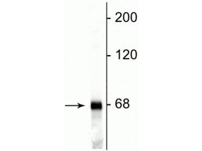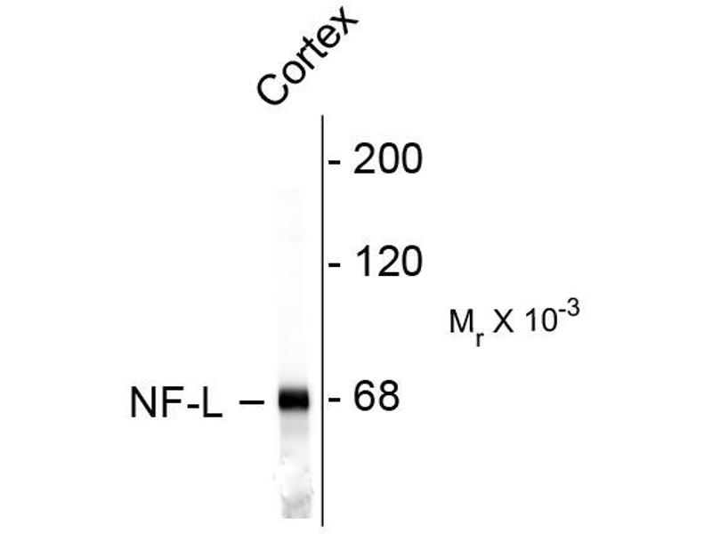 Neurofilaments are the 10nm or intermediate filament proteins found specifically in neurons, and are composed predominantly of three major proteins called NF-L, NF-M and NF-H (1). NF-L is the neurofilament light or low molecular weight polypeptide and runs on SDS-PAGE gels at about 68kDa. Antibodies to NF-L are useful for identifying neuronal cells and their processes in tissue sections and in tissue culture. Mutations in the protein coding region of the human NF-L gene cause some forms of Charcot-Marie-Tooth disease (2). Anti-Neurofilament L Western blot of rat cortex lysate showing specific immunolableing of the ~ 68k NF-L protein.