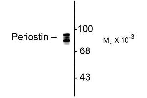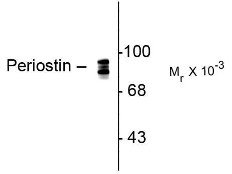 - Specific for endogenous levels of the three periostin bands around ~93 kDa. The immunogenic peptide is present in all known splice variants of periostin and therefore this antibody recognizes all known molecular forms of periostin. The antibody also works well for immunohistochemistry on paraformaldehyde-fixed sections with a simple antigen-retrieval protocol (incubate slides for 20 minutes at 90° C in 10 mM sodium citrate ( pH 6.0)/ 0.1 % Tween-20).