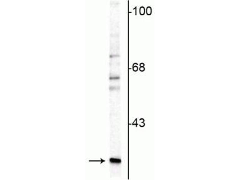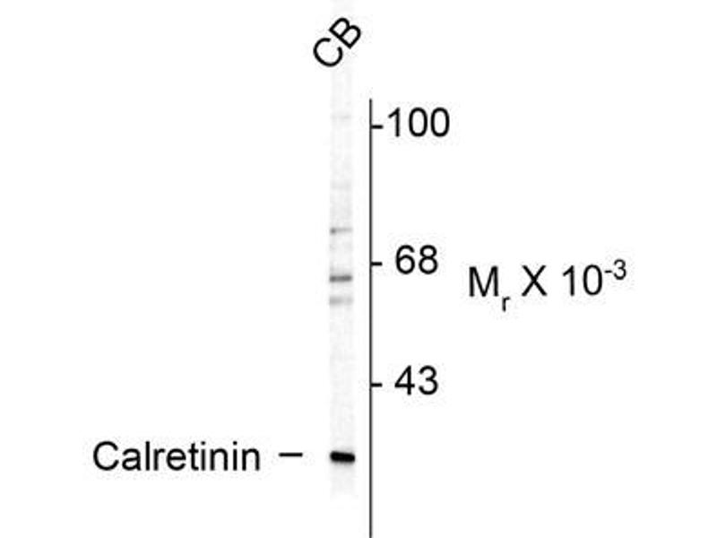 - Specific for endogenous levels of the ~29 kDa calretinin protein in Western blots of rat brain lysate. The antibody also works well for immunohistochemistry on formalin or paraformaldehyde perfused rat brain tissue sections.
