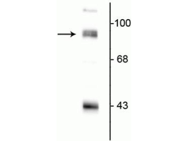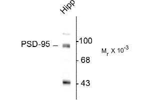 PSD-95 is a very prominent component of the postsynaptic densities of synapses. It contains three PDZ domains which play key roles in its interactions with other proteins in the synapse. It has been proposed that these PDZ domains organize glutamate receptors and their associated signaling proteins and determine the size and strength of synapses (Kim and Sheng, 2004). Recent work suggests that interaction of the NMDAR with PSD-95 via these PDZ domains can be regulated by phosphorylation (Chung et al., 2004). Anti-PSD-95 Western blot of rat hippocampal (Hipp) lysate showing specific immunolabeling of the ~95k PSD-95 protein.
