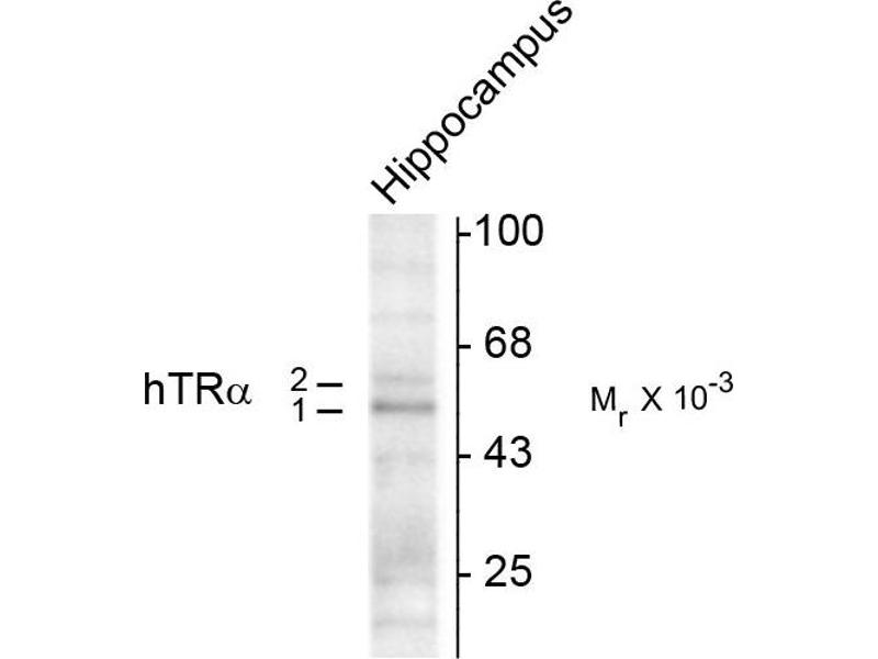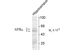 - Specific for endogenous levels of the ~50 kDa TR-α1 and the ~58 kDa TR-α2 proteins.