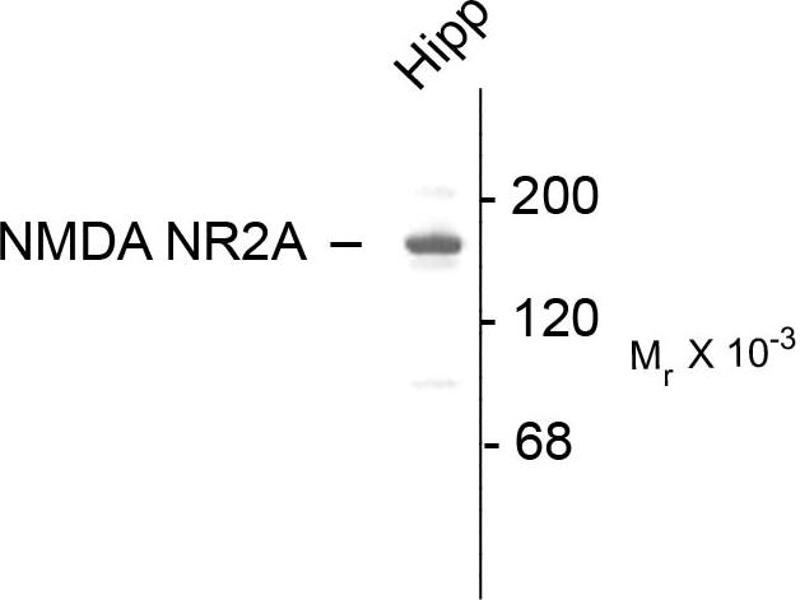 Specific for endogenous levels of the ~180 kDa NR2A subunit of the NMDA receptor. No reactivity towards the NR2B and NR2C subunits. Immunolabeling is blocked by pre-adsorption of antibody with the fusion protein used to generate the antibody.