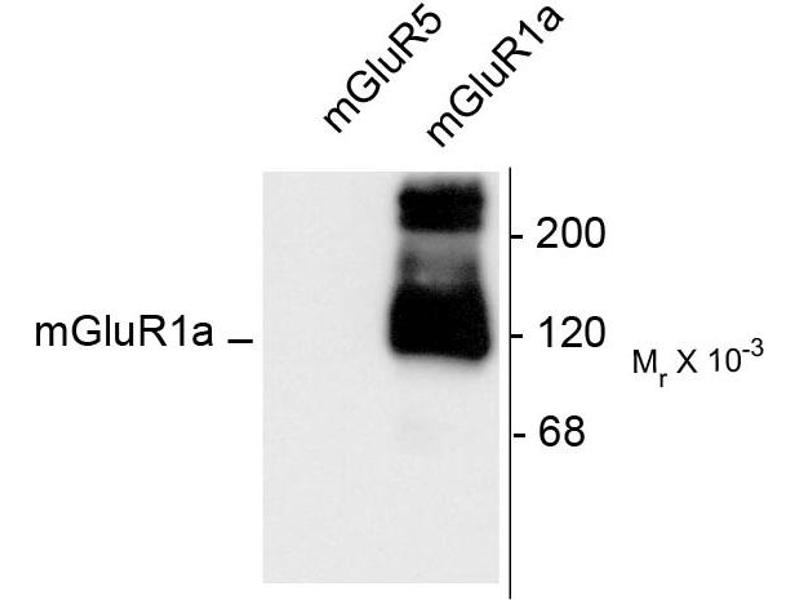 Specific for endogenous levels of the ~125 kDa monomer and the ~250 kDa mGluR1a dimer. Immunolabeling blocked by preadsorption of antibody with the peptide used to generate the antibody.