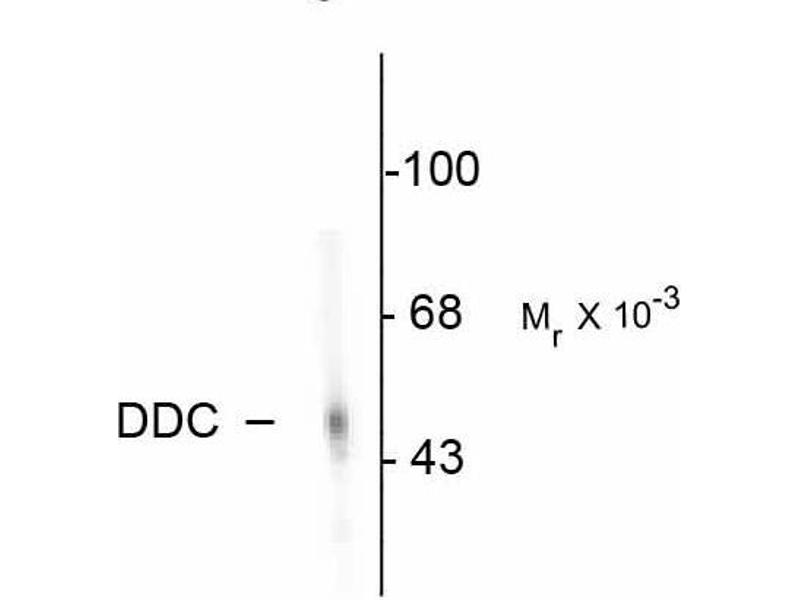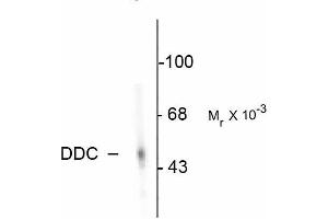 - DOPA decarboxylase (aromatic L-amino acid decarboxylase, AADC, DDC) catalyzes the second reaction in the biosynthesis of catecholamines and serotonin (Waymire and Haycock, 2002, Berry et al., 1996, Haycock et al., 2003). It is also involved in the biosynthesis of trace amines. DDC antibodies can therefore be used as markers for dopaminergic, noradrenergic and serotonergic neurons in a variety of applications including depression, schizophrenia, Parkinson’s disease and drug abuse (Kish et al., 2001, Zhu et al., 2000, Zhu et al., 1999). Anti-DOPA Decarboxylase Western blot of rat adrenal medulla. As shown in the autoradiograph, the antibody is specific for the ~55k DDC protein.