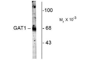 - Specific for endogenous levels of the ~67 kDa GAT-1 protein. Immunolabeling is blocked by pre-adsorption of antibody with the peptide used to generate the antibody.