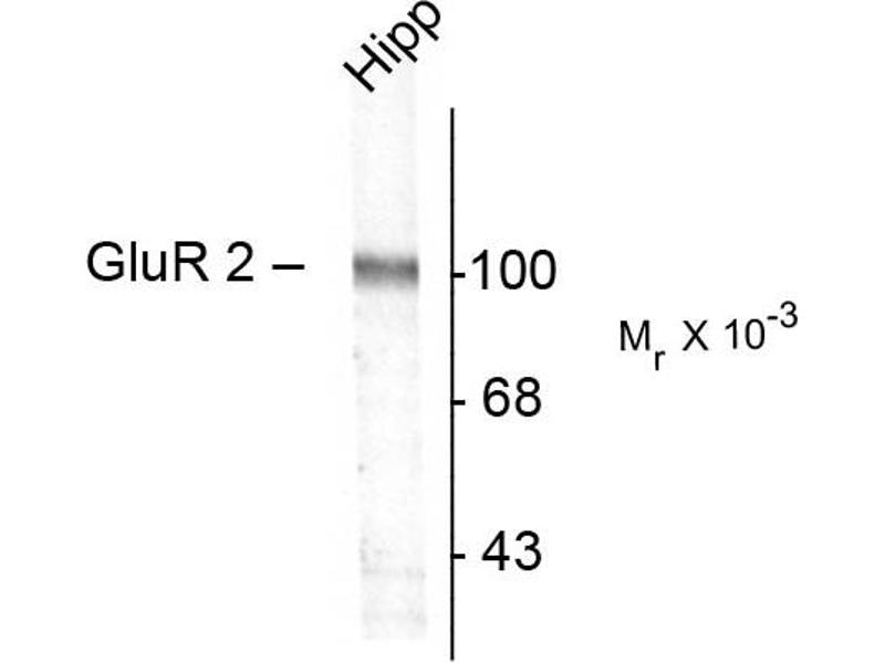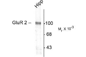 - The ion channels activated by glutamate are typically divided into two classes. Those that are sensitive to N-methyl-D-aspartate (NMDA) are designated NMDA receptors (NMDAR) while those activated by (-amino-3-hydroxy-5-methyl-4-isoxalone propionic acid (AMPA) are known as AMPA receptors (AMPAR). The AMPAR are comprised of four distinct glutamate receptor subunits designated (GluR1-4) and they play key roles in virtually all excitatory neurotransmission in the brain (Keinänen et al., 1990,Hollmann and Heinemann, 1994). The GluR2 subunit is thought to play a key role in forms of synaptic plasticity such as LTD (Chung et al., 2003) Anti-GluR2 Western blot of a rat hippocampal (Hipp) lysate showing the specific immunolabeling of the ~100k GluR2 protein.