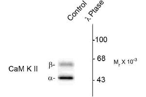 - Specific for endogenous levels of the ~50 kDa α-CaM Kinase II and the ~60 kDa β-CaM Kinase II proteins phosphorylated at Thr286. Immunolabeling is completely eliminated by treatment with λ-phosphatase.