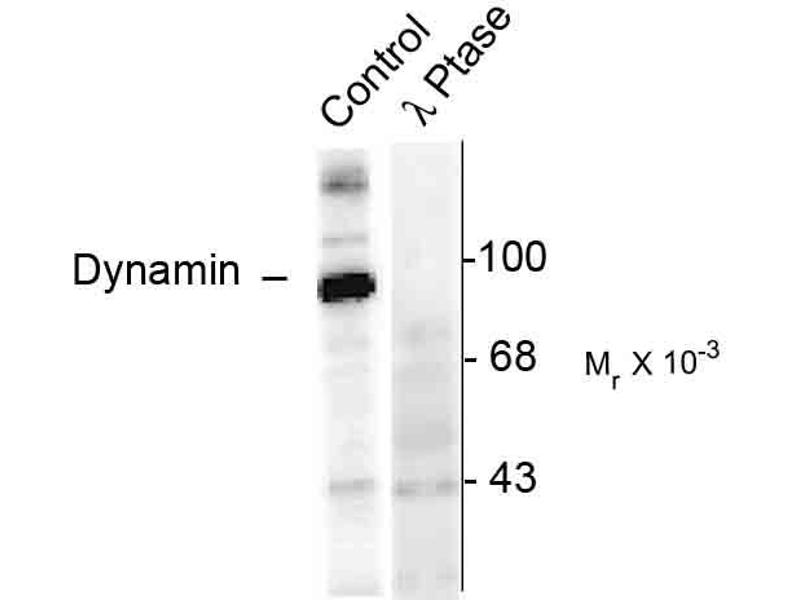 - Specific for endogenous levels of the ~95 kDa dynamin protein phosphorylated at Ser774. Labels the purified protein phosphorylated in vitro by cdk5 but not by PKC. Does not cross react with other purified substrates of cdk5 (e.g. amphiphysin and synapsin). Immunolabeling is blocked by λ-phosphatase treatment.