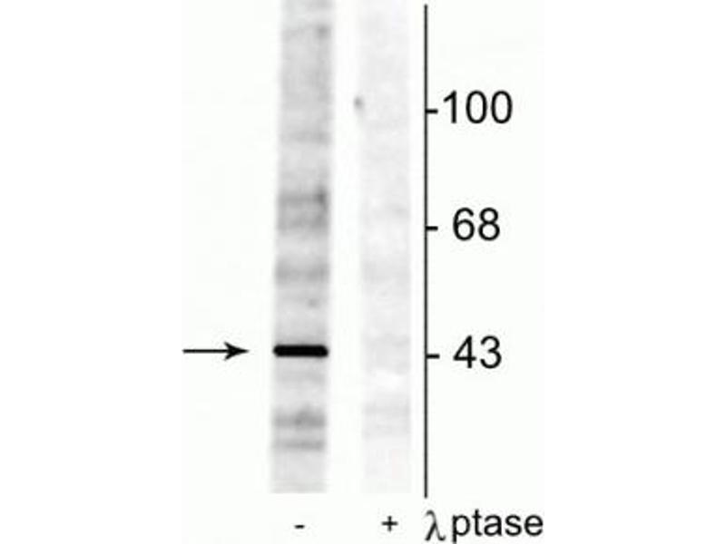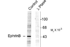- Specific for endogenous levels of the ~46 kDa EphrinB protein phosphorylated at Tyr298. Immunolabeling is completely eliminated by treatment with λ-phosphatase.