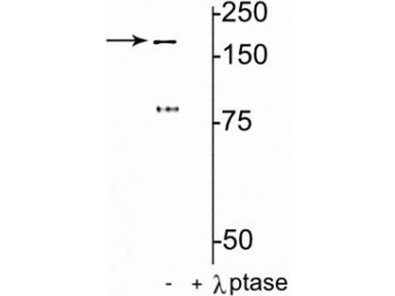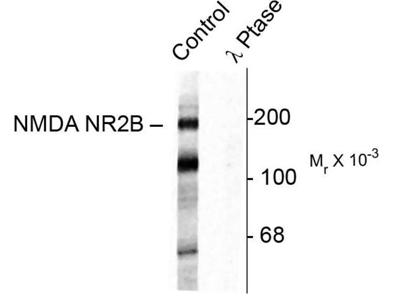 - Specific for endogenous levels of the ~180 kDa NMDAR NR2B-subunit protein phosphorylated at Tyr1472. Immunolabeling is completely eliminated by treatment with λ-phosphatase.