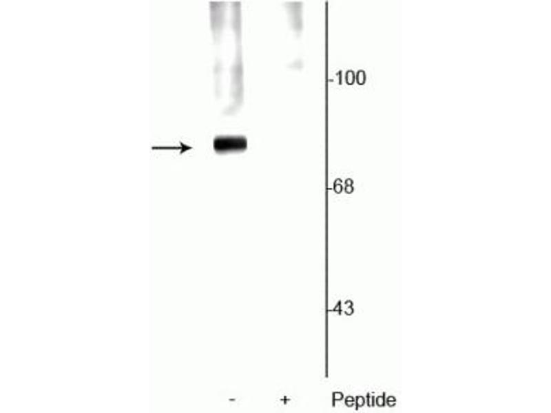 - Specific for endogenous levels of the ~78 kDa synapsin I doublet phosphorylated at Ser62,67. Immunolabeling is blocked by preadsorption with the phosphopeptide used as antigen, but not by the corresponding non-phosphopeptide.