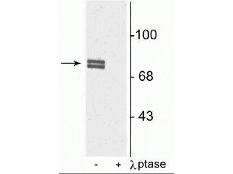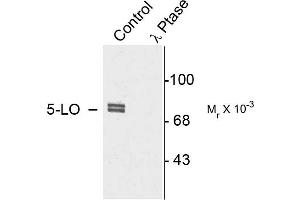 - Specific for endogenous levels of the ~80 kD 5-LO phosphorylated at Ser523 in Western blots. Immunolabeling is completely eliminated by blot treatment with lambda phosphatase (λ-phosphatase, 1200 units for 30 min).