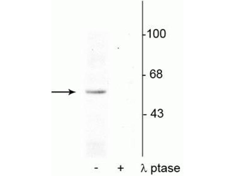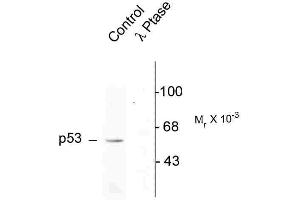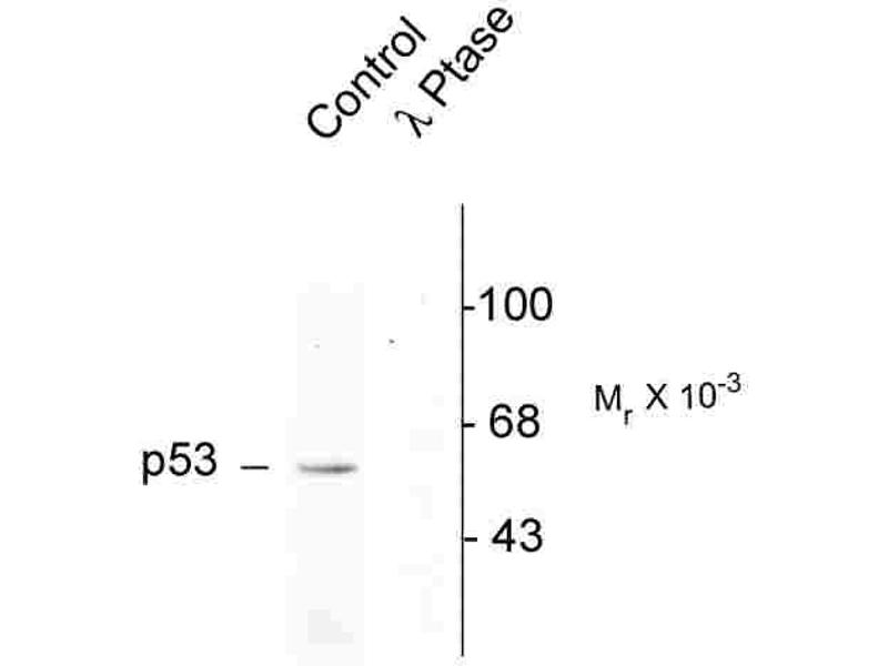 - Specific for endogenous levels of the ~53 kDa p53 protein phosphorylated at Ser392 ~53 kDa p53 protein phosphorylated at Ser392. The immunolabeling is completely eliminated by treatment with λ-phosphatase.