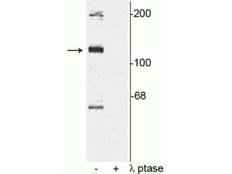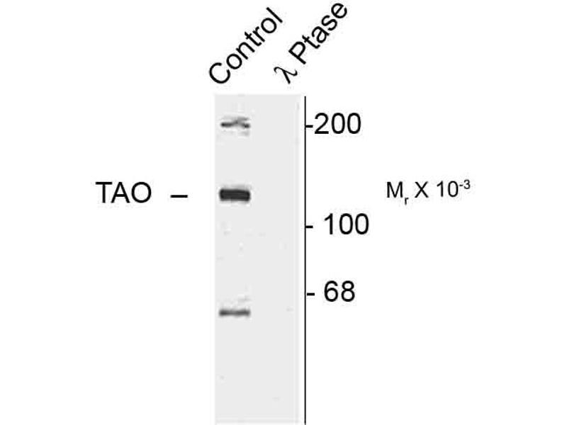 Specific for endogenous levels of the ~120 kDa TAO2 phosphorylated at Ser181. Immunolabeling is completely eliminated by treatment with λ-phosphatase.