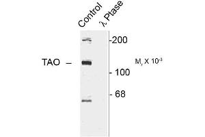 - Specific for endogenous levels of the ~120 kDa TAO2 phosphorylated at Ser181. Immunolabeling is completely eliminated by treatment with λ-phosphatase.