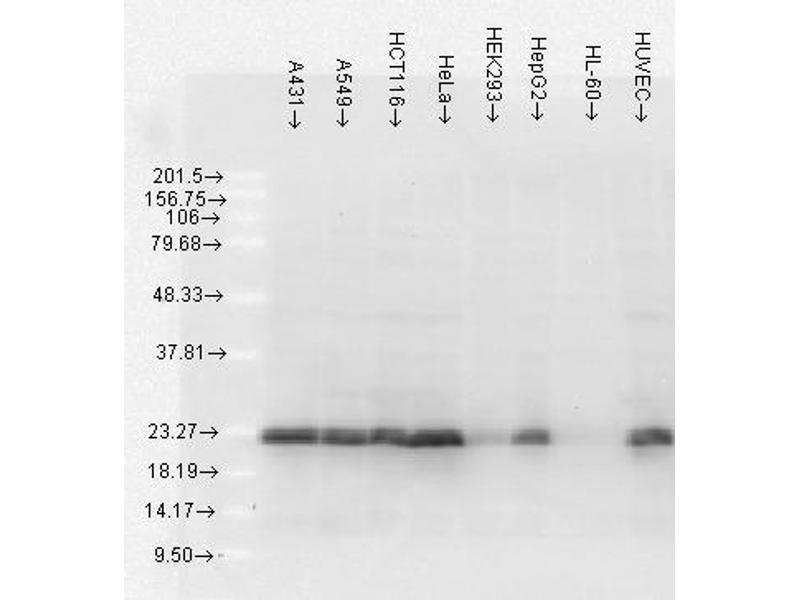 0.5 μg/ml of ABIN361649 was sufficient for detection of HSP27 in 10 μg of HeLa lysate by colorimetric immunoblot analysis using Goat anti-mouse IgG:HRP as the secondary antibody.