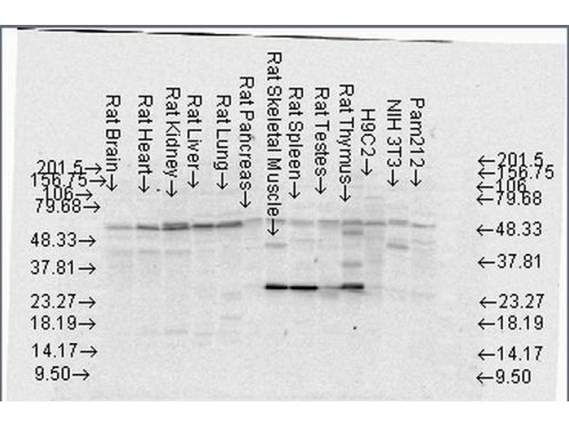 - Detects ~52 kDa. Heavy chain migrates close to FKBP52 on SDS PAGE.