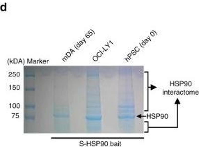 HSP90 is an abundantly and ubiquitously expressed heat shock protein. It is understood to exist in two principal forms α and β, which share 85 % sequence amino acid homology. The two isoforms of HSP90, are expressed in the cytosolic compartment (1). Despite the similarities, HSP90α exists predominantly as a homodimer while HSP90β exists mainly as a monomer (2). From a functional perspective, HSP90 participates in the folding, assembly, maturation, and stabilization of specific proteins as an integral component of a chaperone complex (3-6). Furthermore, HSP90 is highly conserved between species, having 60 % and 78 % amino acid similarity between mammalian and the corresponding yeast and Drosophila proteins, respectively. HSP90 is a highly conserved and essential stress protein that is expressed in all eukaryotic cells. Despite it's label of being a heat-shock protein, HSP90 is one of the most highly expressed proteins in unstressed cells (1-2 % of cytosolic protein). It carries out a number of housekeeping functions - including controlling the activity, turnover, and trafficking of a variety of proteins. Most of the HSP90-regulated proteins that have been discovered to date are involved in cell signaling (7-8). The number of proteins now know to interact with HSP90 is about 100. Target proteins include the kinases v-Src, Wee1, and c-Raf, transcriptional regulators such as p53 and steroid receptors, and the polymerases of the hepatitis B virus and telomerase (5). When bound to ATP, HSP90 interacts with co-chaperones Cdc37, p23, and an assortment of immunophilin-like proteins, forming a complex that stabilizes and protects target proteins from proteasomal degradation. In most cases, HSP90-interacting proteins have been shown to co-precipitate with HSP90 when carrying out immunoadsorption studies, and to exist in cytosolic heterocomplexes with it. In a number of cases, variations in HSP90 expression or HSP90 mutation has been shown to degrade signaling function via the protein or to impair a specific function of the protein (such as steroid binding, kinase activity) in vivo. Ansamycin antibiotics, such as geldanamycin and radicicol, inhibit HSP90 function (9). For more information visit our HSP90 Scientific Resource Guide at http://www.HSP90.ca.