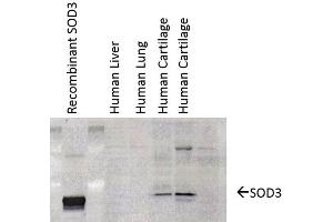 1 μg/ml of ABIN361741 was sufficient for detection of EC-SOD in 20 μg of human cartilage lysate by colorimetric immunoblot analysis using Goat anti-mouse IgG:HRP as the secondary antibody.