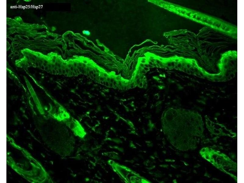 - HSP25 is the mouse homologue of the human HSP27 protein, a member of the small heat shock protein family comprised of a diverse group of proteins from ~15 to >30 kDa(1). The basic structure of most sHSPs is a homologous and highly conserved amino acid sequence, with an α-crystallin-domain at the C-terminus and the WD/EPF domain at the less conserved N-terminus. This N-terminus is essential for the development of high molecular oligomers (2, 3). HSP27-oligomers consist of stable dimers formed by as many as 8-40 HSP27 protein monomers (4). The oligomerization status is connected with the chaperone activity: aggregates of large oligomers have high chaperone activity, whereas dimers have no chaperone activity (5). HSP27 is localized to the cytoplasm of unstressed cells but can redistribute to the nucleus in response to stress, where it may function to stabilize DNA and/or the nuclear membrane. It can be rapidly phosphorylated in response to physiological stimuli relevant to the cell type examined. Thus, HSP27 has been suggested to be an important intermediate in second messenger-mediated signaling pathways (6). Other functions include chaperone activity (as mentioned above), thermo-tolerance in vivo, inhibition of apoptosis, and signal transduction. Specifically, in vitro, it acts as an ATP-independent chaperone by inhibiting protein aggregation and by stabilizing partially denatured proteins, which ensures refolding of the HSP70 complex. HSP27 is also involved in the apoptotic signaling pathway because it interferes with the activation of cytochrome c/Apaf-1/dATP complex, thereby inhibiting the activation of procaspase-9. It is also hypothesized that HSP27 may serve some role in cross-bridge formation between actin and myosin (7). And finally, HSP27 is also thought to be involved in the process of cell differentiation. The up-regulation of HSP27 correlates with the rate of phosphorylation and with an increase of large oligomers. It is possible that HSP27 may play a crucial role in termination of growth (8). For more information visit our HSP27 Scientific Resource Guide at http://www.HSP27.com.