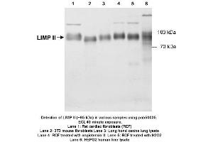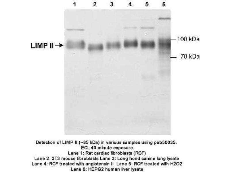 - Reacts with human, rat, canine and mouse LIMPII/lgp85 protein