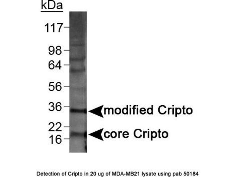 - Reacts with mouse ~18 kDa (core form) and ~36 kDa (glycosylated/ post-transcriptionally modified form) TDGF1 protein