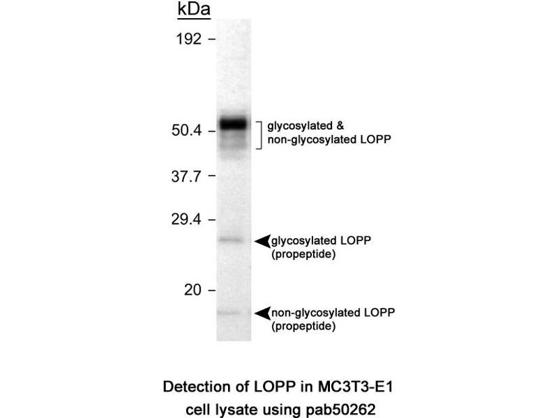- Reacts with the mouse LOPP pro-enzyme (50 kDa) and pro-peptide Cross reacts with rat protein
