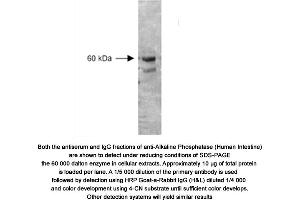 Purified antibody reacts with alkaline phosphatase from human intestine showing a 60 kDa band against this enzyme under reducing conditions of SDS-PAGE Elevated expression of this enzyme is associated with undifferentiated pluripoten stem cell (PSC).