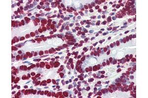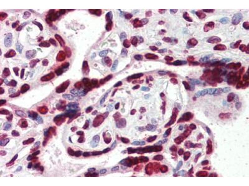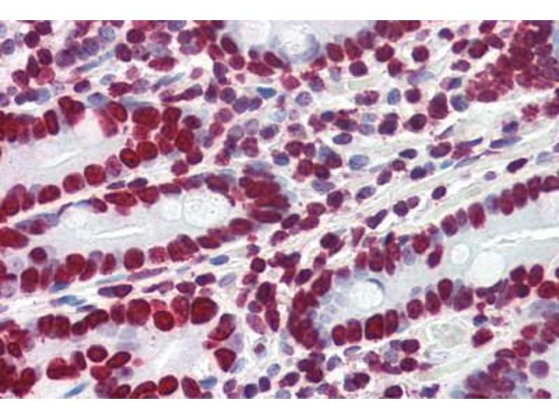 Usage: Immunohistochemistry: This antibody was validated for use in immunohistochemistry on a panel of 21 formalin-fixed, paraffin-embedded (FFPE) human tissues after heat induced antigen retrieval in pH 6.0 citrate buffer. After incubation with the primary antibody, slides were incubated with biotinylated secondary antibody, followed by alkaline phosphatase-streptavidin and chromogen. The stained slides were evaluated by a pathologist to confirm staining specificity. The optimal working concentration for this antibody was determined to be 4 μg/mL. -