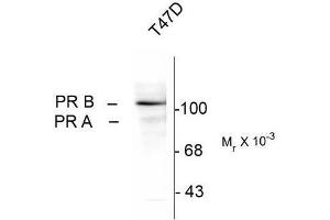 There is accumulating evidence to suggest that progesterone plays an essential role in the regulation of growth and differentiation of mammary glands and thus may play a key role in breast cancer (Edwards, 2005). The biological response to progesterone is mediated by two distinct forms of the human progesterone receptor (PR-A and PR-B forms). In most cell contexts, the B form functions as a transcriptional activator, whereas the A form functions as a transcriptional inhibitor of steroid hormones (Attia et al., 2000, Lin et al., 2003). Recently it has been demonstrated that there is differential hormone dependent regulation of the phosphorylation of the A and B forms of the receptor (Clemm et al., 2000) . Treatment of T47D breast cancer cells with progestin agonist increases the phosphorylation of Ser190 and Ser294 with different kinetics. These phosphorylation events may differentially affect the transcriptional activity of the receptor.Synonyms: NR3C3, Nuclear Receptor Subfamily 3 Group C Member 3, PGR, PR