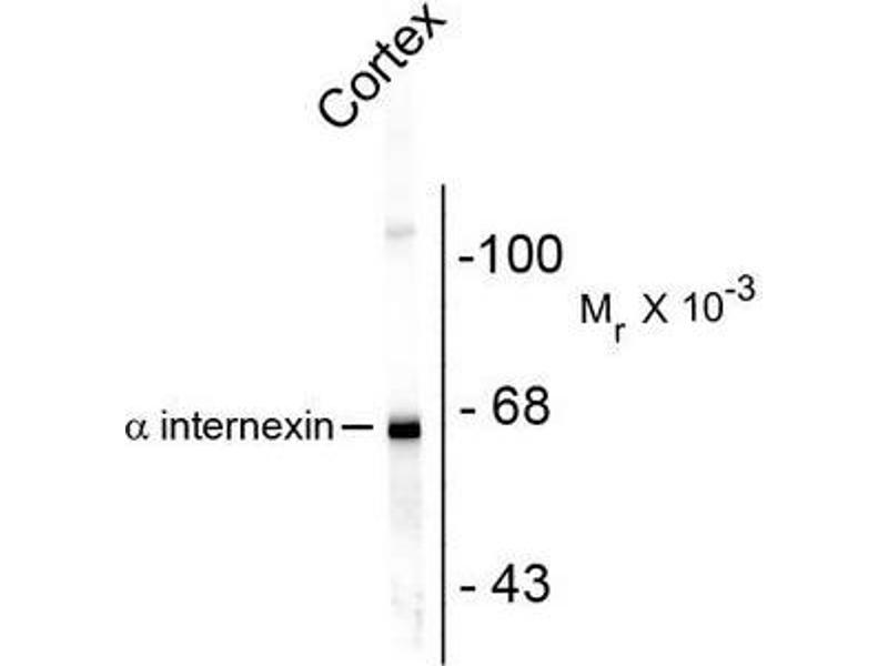 Specific for the ~66k alpha Internexin protein. Minor bands at ~150k are probably covalent dimers and bands at ~50k represent Alpha-Internexin breakdown products.