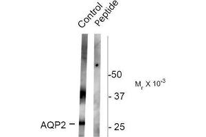 Specific for ~29k AQP2 protein phosphorylated at Ser261. This antibody Also recognizes the glycosylated form of AQP2 at ~37k. Immunolabeling of the AQP2 band is blocked by preadsorption with the phospho-peptide used as antigen but not by the corresponding dephospho-peptide.