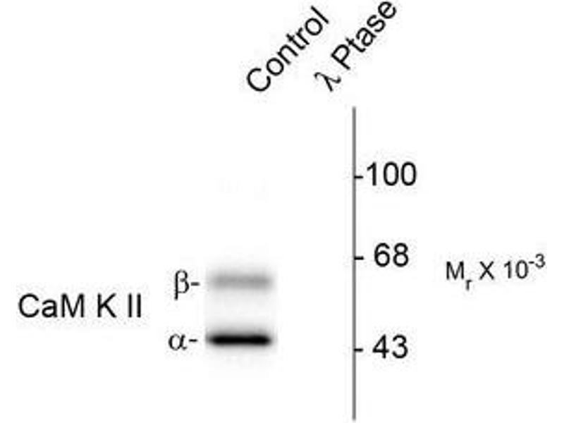 Specific for the ~50k Alpha-CaM Kinase II and the ~60k Beta-CaM Kinase II proteins phosphorylated at Thr286. Immunolabeling is blocked by the lambda-phosphatase treatment.
