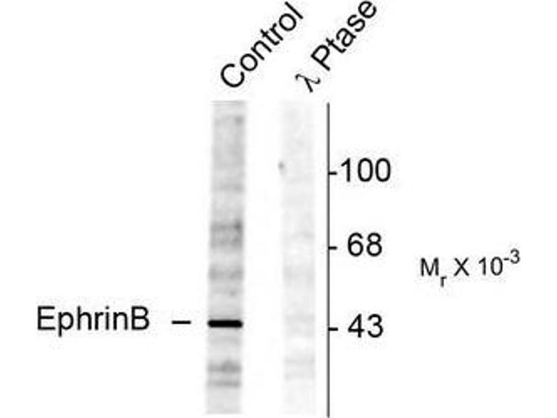 Specific for the ~46k Ephrin-B protein phosphorylated at Tyr298. Immunolabeling of the Ephrin-B band is blocked by lambda-phosphatase treatment.