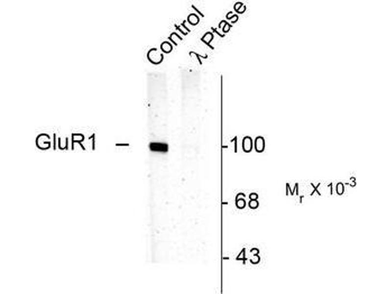 Specific for the ~100k GluR1 protein phosphorylated at Ser831. Immunolabeling is blocked by the phosphopeptide used as antigen but not by the corresponding dephosphopeptide. Immunolabeling is completely eliminated by lambda-phosphatase treatment.