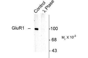 The ion channels activated by glutamate are typically divided into two classes. Those that are sensitive to N-methyl-D-aspartate (NMDA) are designated NMDA receptors (NMDAR) while those activated by alpha-amino-3-hydroxy-5-methyl-4-isoxalone propionic acid (AMPA) are known as AMPA receptors (AMPAR). The AMPAR are comprised of four distinct glutamate receptor subunits designated (GluR1-4) and they play key roles in virtually all excitatory neurotransmission in the brain (Keinänen et al., 1990, Hollmann and Heinemann, 1994). The GluR1 subunit is widely expressed throughout the nervous system. GluR1 is potentiated by phosphorylation at Ser831 which has been shown to be mediated by either PKC or CaM kinase II (McGlade-McCulloh et al., 1993, Mammen et al., 1999, Roche et al., 1996). In addition, phosphorylation of this site has been linked to synaptic plasticity as well and learning and memory (Soderling and Derkach, 2000).Synonyms: AMPA-selective glutamate receptor 1, AMPA1, GLUH1, GRIA1, GluR-1, GluR-A, GluR-K1, Glutamate receptor ionotropic