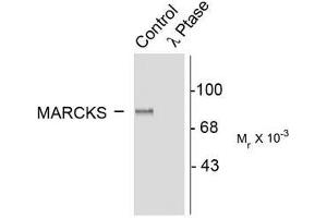 Myristoylated Alanine-Rich C Kinase Substrate (MARCKS) is a major substrate for phosphorylation by protein kinase C (PKC) (Ouimet et al., 1990). The phosphorylation of Ser152/156 can be used as a measure of PKC activation although these sites are also phosphorylated by PRK1 (Palmer et al., 1996) MARCKS is a member of a family of calmodulin binding proteins and phosphorylation of Ser152/156 modulates the binding of MARCKS to calmodulin (Verghese et al., 1994).Synonyms: MACS, Myristoylated alanine-rich C-kinase substrate, PRKCSL