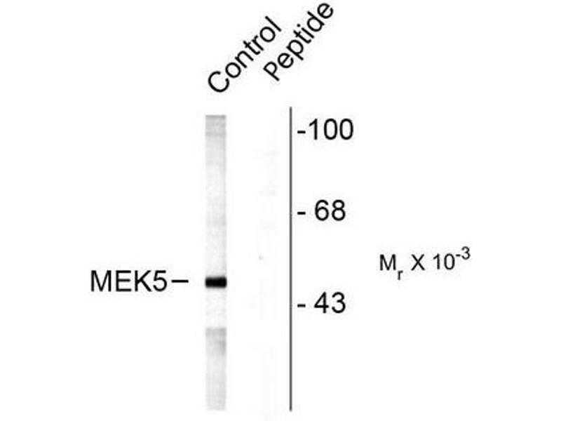 This antibody is specific for the ~49k MEK5 protein phosphorylated at Ser311, Thr315. Immunolabeling of the MEK5 band is blocked by preadsorption with the phospho-peptide used as antigen but not be the corresponding dephospho-peptide.