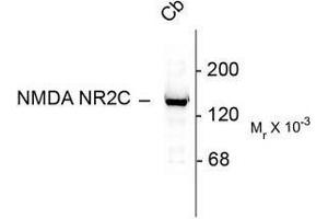 This antibody recognizes the ~140k NR2C subunit of the NMDA Receptor. Also labels the ~180k NR2A and the ~180k NR2B subunits of the NMDA Receptor. Immunolabeling is blocked by preadsorption of antibody with the immunogen that was used to generate the antibody.