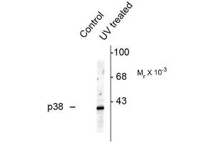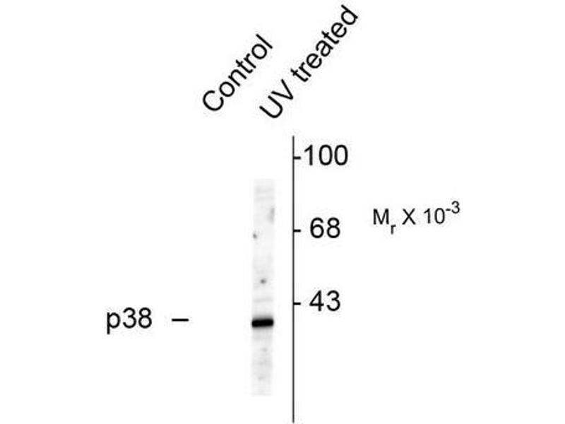 This antibody recognizes the ~39k p38 MAPK protein phosphorylated at Thr180/Tyr182. Immunolabeling is blocked by preadsorption of the antibody with the phosphopeptide used as antigen but not by the corresponding dephosphopeptide.