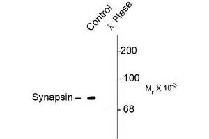 This antibody recognizes the ~78k Synapsin I doublet protein phosphorylated at Ser549. Immunolabeling of the synapsin I band is blocked by lambda-phosphatase treatment.