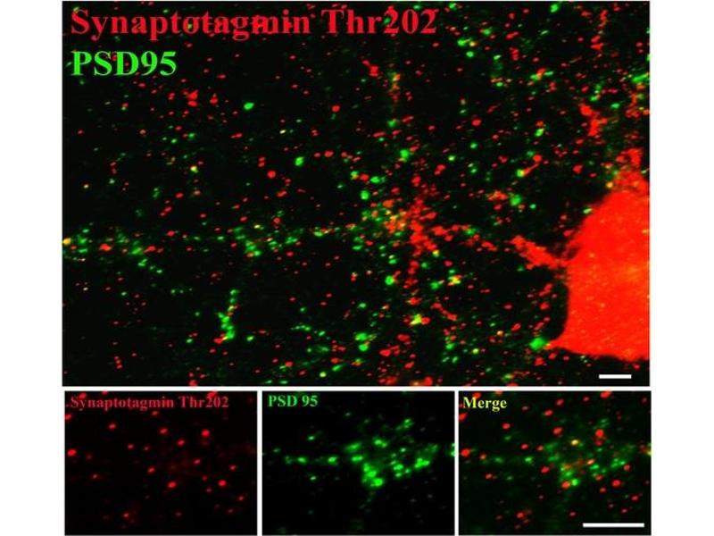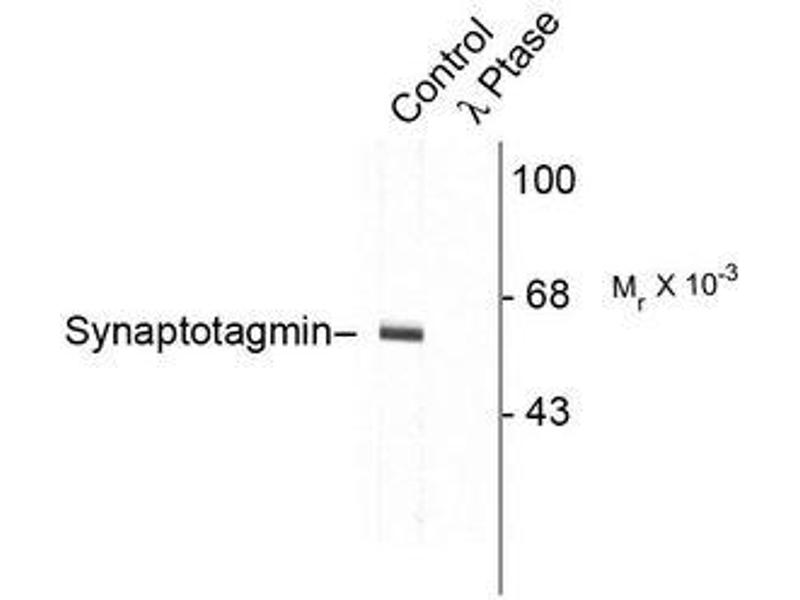 This antibody recognizes the ~60k-62k synaptotagmin protein phosphorylated at Thr202 in Western Blots of Rat brain lysate. The immunolabeling is completely eliminated by lambda-phosphatase treatment.