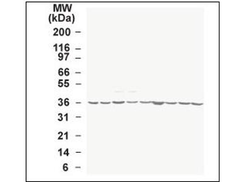 Glyceraldehyde 3 phosphate dehydrogenase (GAPDH) is well known as one of the key enzymes involved in glycolysis. Besides its functioning as a glycolytic enzyme in cytoplasm, recent evidence suggest that mammalian GAPDH is also involved in a great number of intracellular proceses such as membrane fusion, microtubule bundling, phosphotransferase activity, nuclear RNA export, DNA replication, and DNA repair. During the last decade a lot of findings appeared concerning the role of GAPDH in different pathologies including prostate cancer progression, programmed neuronal cell death, age-related neuronal diseases, such as Alzheimer's and Huntington's disease. GAPDH is constitutively expressed in almost all tissues at high levels, therefore becoming the marker of choice when a loading control in Western blotting is required. Some physiological factors, such as hypoxia and diabetes, increase GAPDH expression in certain cell types.Synonyms: CDABP0047, GAPD, Glyceraldehyde-3-Phosphate Dehydrogenase