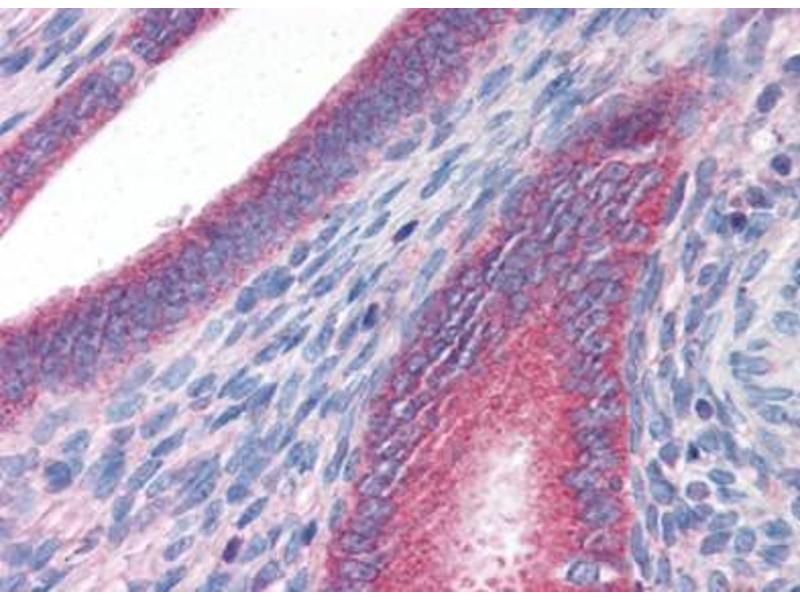 ELISA. Western blot: 0.5-1.0 μg/mL. Immunohistochemistry on Frozen Sections: 2.5 μg/mL. Immunohistochemistry on Paraffin Sections: 3 μg/mL. This antibody was validated for use in immunohistochemistry on a panel of 21formalin-fixed, paraffin-embedded (FFPE) human tissues after heat induced antigenretrieval in pH 6.0 citrate buffer. After incubation with the primary antibody, slides wereincubated with biotinylated secondary antibody LS-D1, followed by alkalinephosphatase-streptavidin and chromogen. Other applications not tested. Optimal dilutions are dependent on conditions and should be determined by the user.