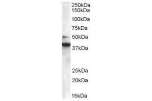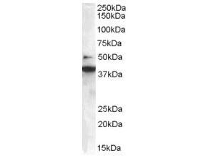 Peptide ELISA: Limit dilution 1: 32000. Western blot: 0.3-1.0 μg/mL. Approx 38 kDa band observed in lysates of Human T cell lineJurkat and in Human Lung and Placenta (calculated MW of 40.8 kDa according toNP_057093.1).