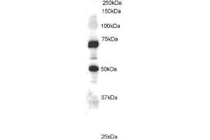 Peptide ELISA: Limit dilution 1: 32000. Western blot: Recommended for use at 1-2 μg/mL. Approx 70 kDa and 50 kDa bands seen inJurkat cell lysate. Note the smaller isoform of this protein has a consensus glycosylationsite, which may explain the higher than expected band size (50 kDa versus 30 kDa). Glycosylation can affect migration of proteins on SDS-PAGE [Hames, B. D and Rickwood, D. ,eds. Gel electrophoresis of proteins: a practical approach. Oxford University Press].
