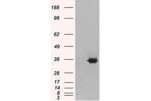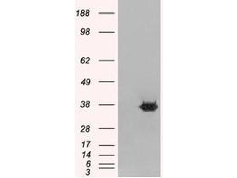 Peptide ELISA: 1/32000. Western blot: 1 - 3 μg/mL. Approx 35 kDa band observed in Human Brain and A431 lysates(calculated MW of 32.5 kDa according to NP_036418.1).