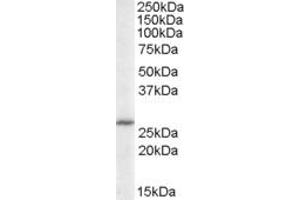 Peptide ELISA: Limit dilution: 1/1000. Western blot: 0.3-1 μg/mL. Approx 26 kDa band observed in Human lymph node lysates. Other applications not tested. Optimal dilutions are dependent on conditions and should be determined by the user.